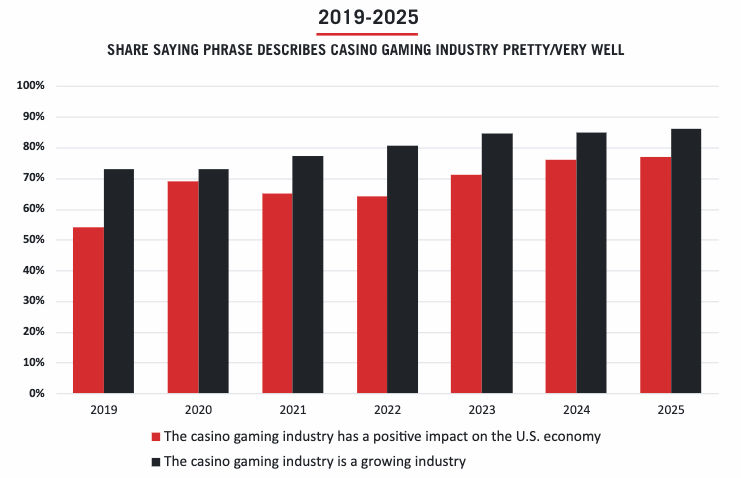 Americans overwhelmingly recognise the gaming industry’s role in driving national and local economies. The survey shows 77 percent of adults believe gaming positively impacts the US economy, with most crediting casinos for job creation, tourism, and investment.